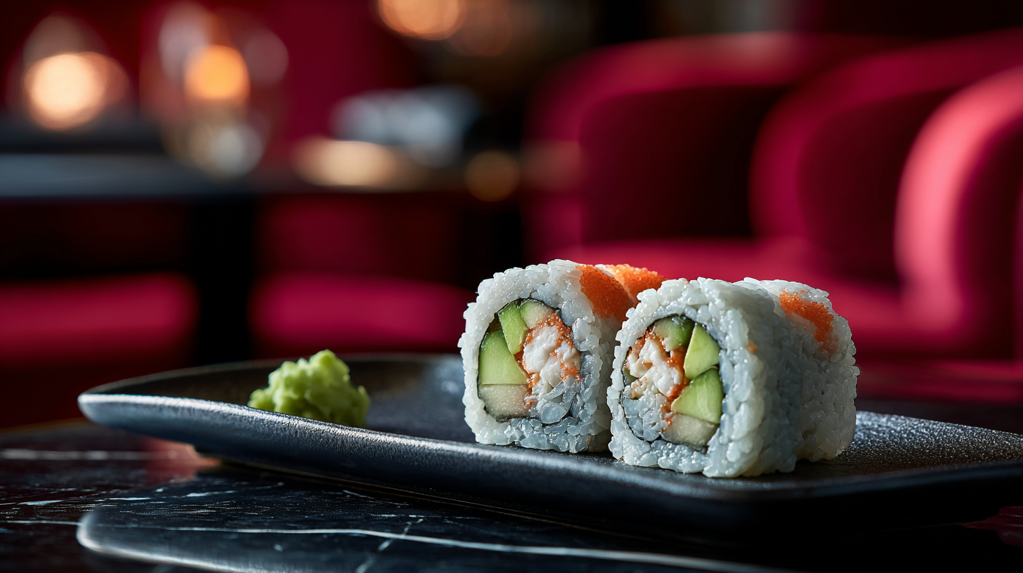Crab, avocado and cucumber rolled with sushi rice and toasted sesame, served with soy and wasabi.