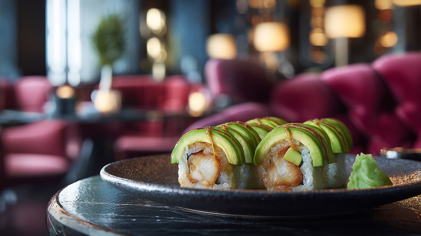 Eel and cucumber inside, topped with avocado slices and eel glaze for a rich, silky finish.