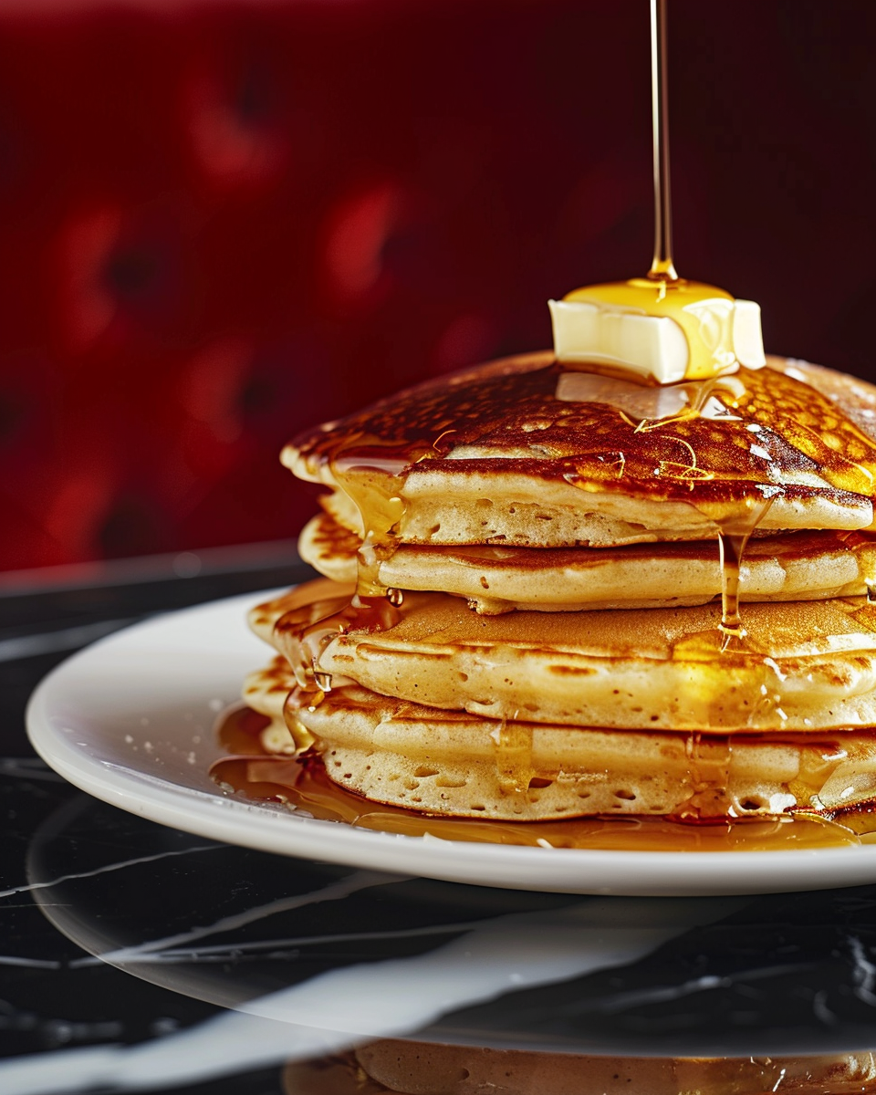 Fluffy buttermilk pancakes stacked and served with maple syrup and butter.