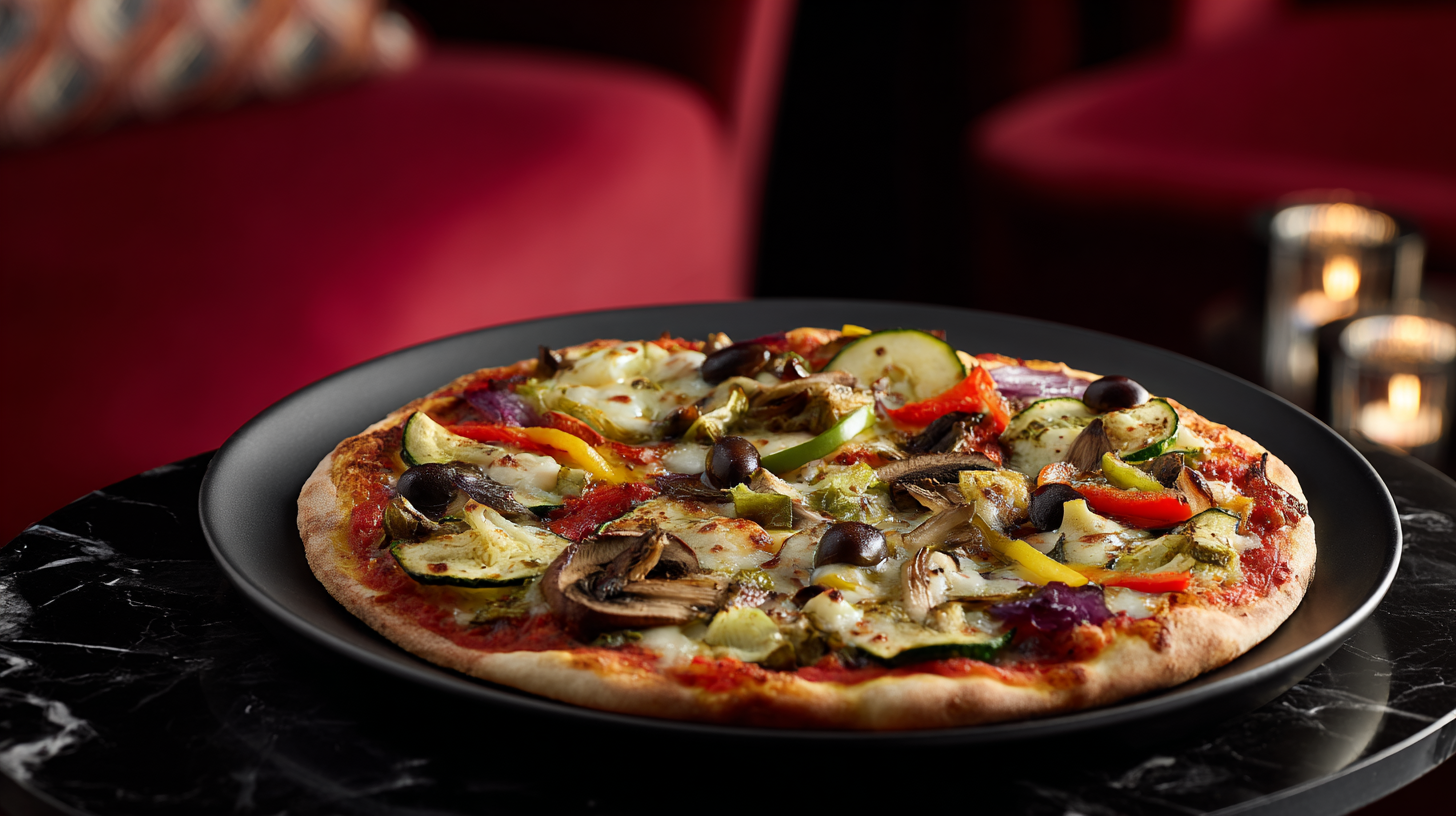 A colorful baked pizza topped with seasonal vegetables, tomato sauce, and melted cheese for a fresh, lighter bite.