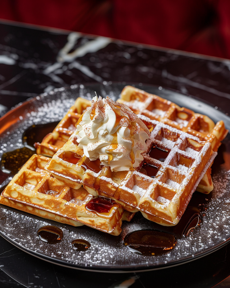 Crisp Belgian waffles, golden and airy, served with maple syrup and whipped cream.